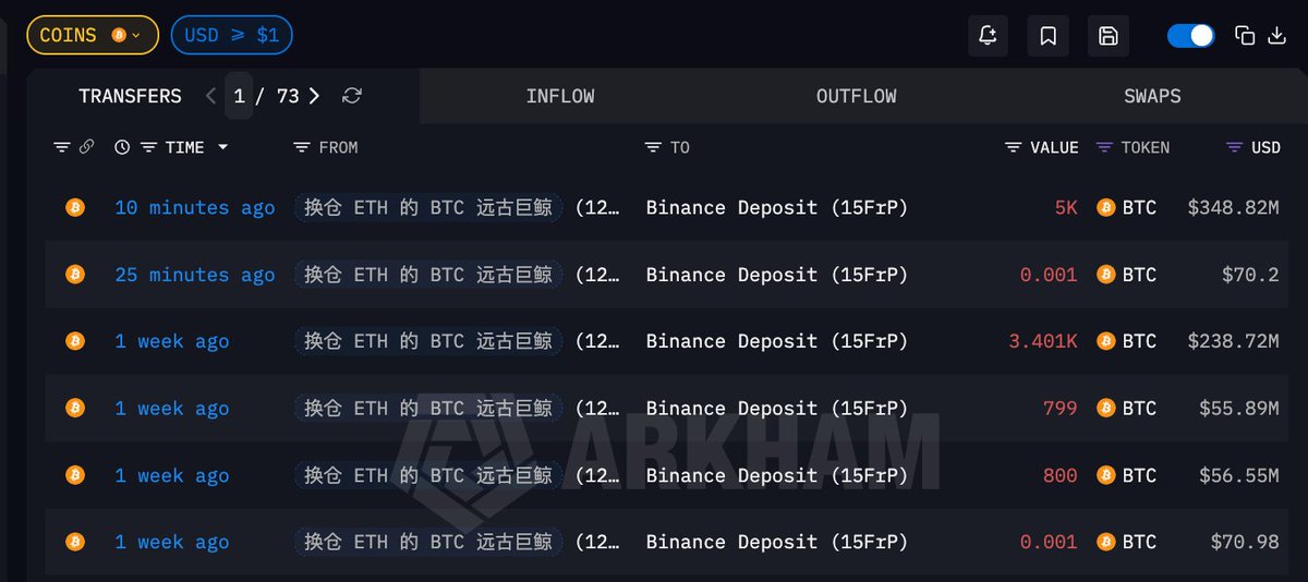 他在 8 分钟前向 #Binance 充值了价值 3.48 亿美元的 $BTC ,参考一周前的操作,或为抛售行为,可以再等等看后续是否会有稳定币提出