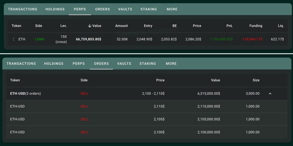 此外,他还在 [$2,100 - $2,110] 区间挂了 3000 ETH 的限价卖单,两个地址目前累计持有 77,000 枚 ETH 的多单,总价值 1.6 亿美元