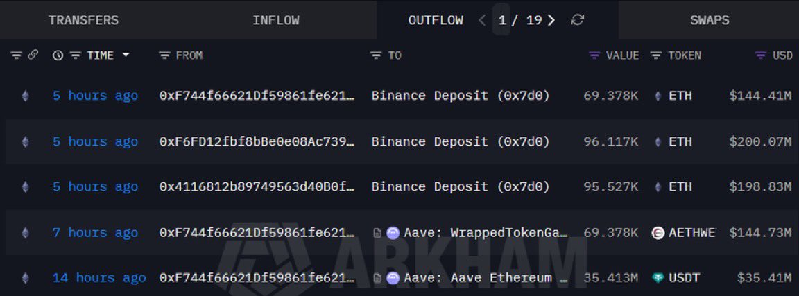 「爆仓 2.3 亿美元的 1011 巨鲸」过去 40 分钟向 #Binance 充值了 261024.44 枚 ETH,总价值 5.43 亿美元,平均充值价格 $2081.51