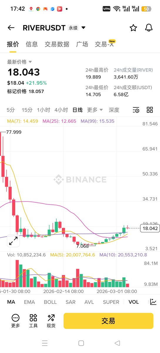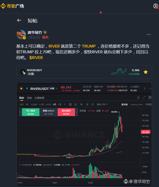 不容易啊,老唐也蒙对一回,1月29日在 #币安广场 发的帖子,是否可以吹一吹了?当时 $River 风头正劲,飙升到80U稍微回踩,很多人在抓机会抄底搏反弹,想想当时大家多疯狂啊,老唐当时说River 会和Trump 一样,真的压力好大啊,遭到好多鄙视。现在River 到了8.6U,潮水褪去终于看到谁在裸泳了。 @RiverdotInc @River4fun