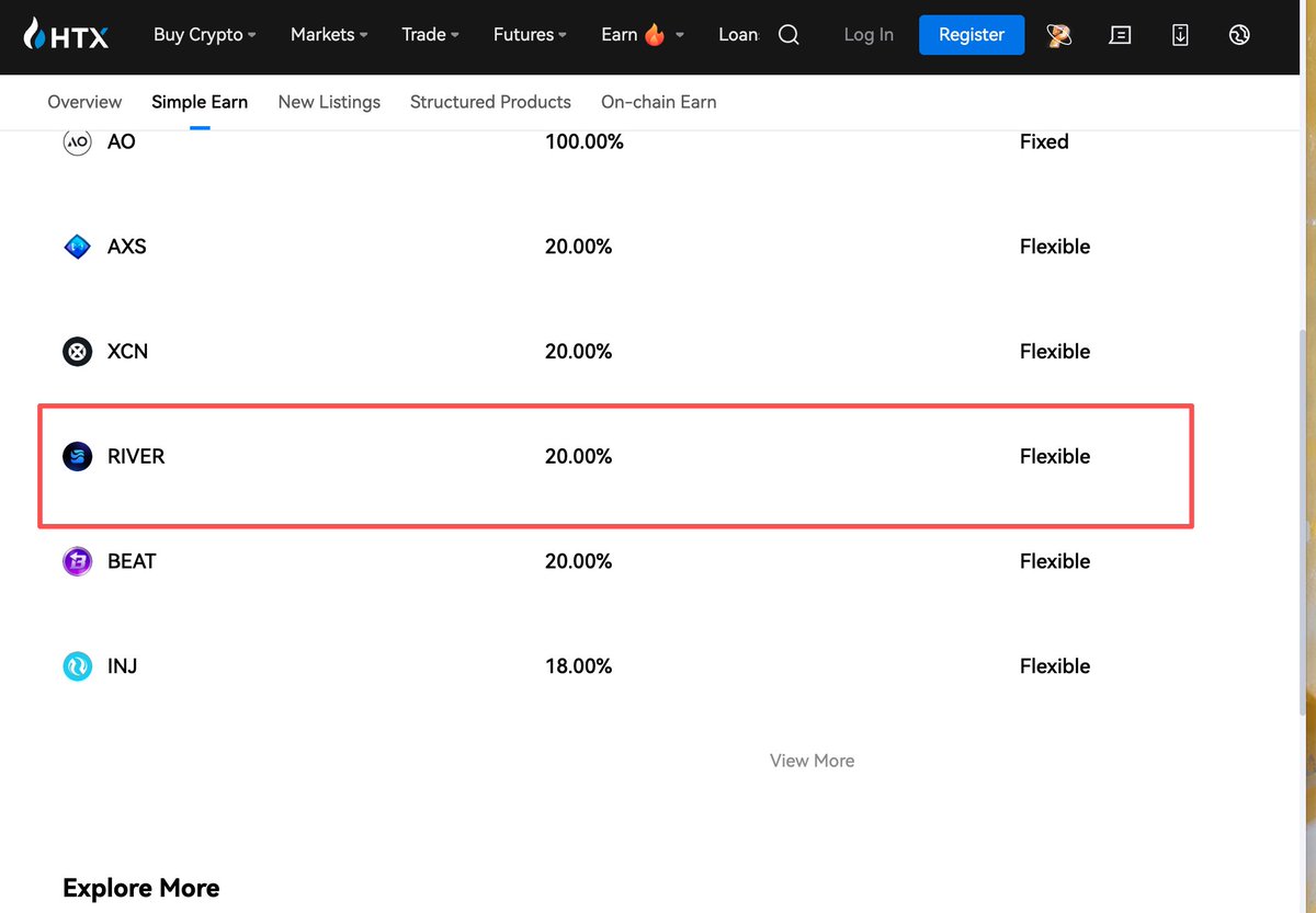 目前 $RIVER 在HTX上有个活期理财,APY大约在20%,有币的可以考虑一下!