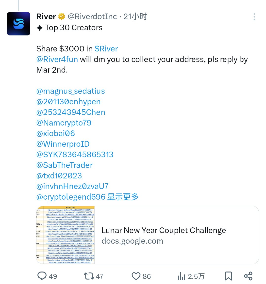 然后昨天 @RiverdotInc 公布了新春春联创作比赛的获奖名单了,这次还是幸运的拿到了100U $River !