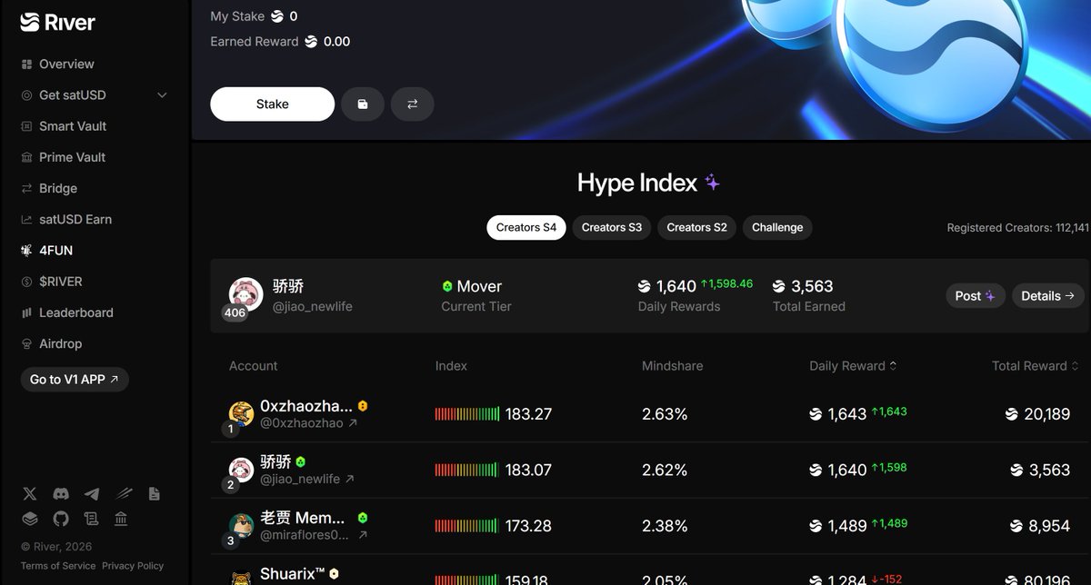 用户可以质押 $RIVER 或参与生态池,获取收益,同时也能参与更多生态激励。
