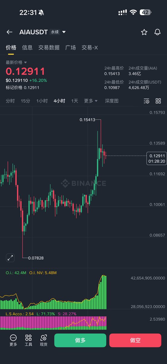 用时一个月 $Aia 踏马又回来了! 二进宫上线币安合约。 做空需谨慎 低位开多。 了解到你背景通天了 这一次格局打开 别在做人人喊打的狗庄了!