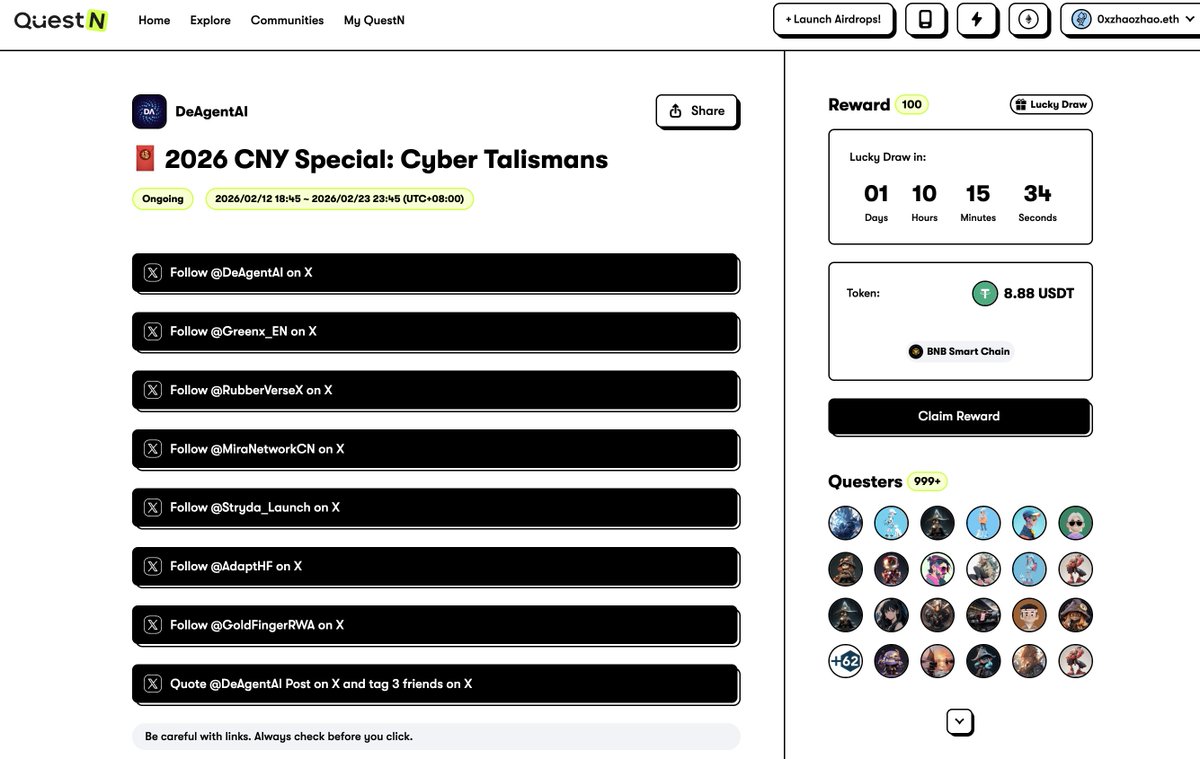 马上过年了,交易所项目方都在送福利,我就说@DeAgentAI不会落下吧!这不来了! DeAgentAI 联合 6 家生态伙伴搞的新年抽奖活动来啦,纯 0 撸无成本,春节没事干的朋友可以顺手参与一下 活动时间 2 月 12 日 - 2 月 23 日,总奖池 888USDT,最后会抽 100 位幸运儿瓜分,玩法也简单: 点击链接进入活动页:https://t.co/eSrjeBWros 绑定钱包,完成基础关注任务 除夕到初六连续 7 天,每天转发活动推文并写下新年愿望,就能收集 1 张护身符,集齐 7 张参与最终抽奖 虽说这个奖池比不上交易所的大手笔,但胜在任务零门槛,不用投入一分钱,而且目测参与人数不会太多,中奖概率还挺可观的,春节闲来无事撸一波,万一中奖了呢 顺带提一句, $AIA 在 2025 年给持有者带来了不少惊喜,也期待 2026 年能继续冲,趁这个活动顺手参与,也是不错的选择 $AIA #DeAgentAI #春节crypto福利