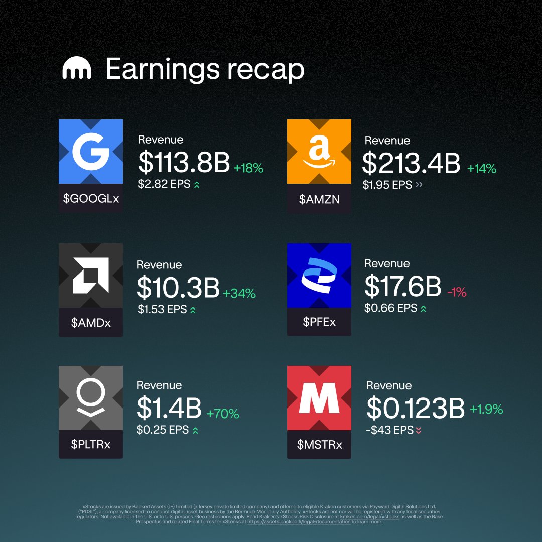 Catch up on last week’s earnings. Track companies like $GOOGLx and $AMZNx in the Kraken app ⤵️