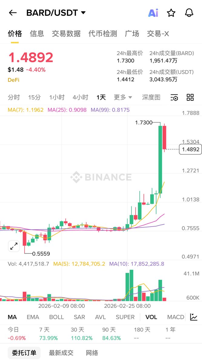 0.55 ➡️ 1.73 3倍的涨幅 发生了什么? 如果大家看日K,就能发现Lombard的 BARD在0.8左右很坚挺 即使是BTC和大盘再跌也没有出现萎靡不振的状态 如果大家去对比一下同期的其他BTC生态项目😂 应该不用看了,都是一路向下 外面所有的龙头,都是项目自己给的 只有Lombard是社区和价格支撑共同给的 龙头从来不是靠嘴上说 而是靠社区的共识和币价值的共同反应 BTC生态,目前只有 $BARD 做到了