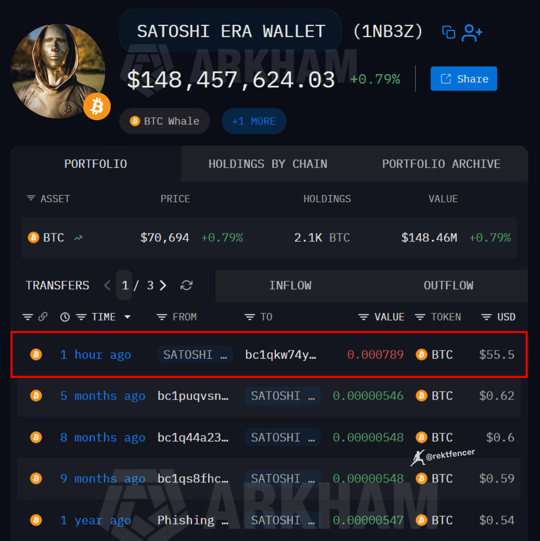The coins, originally worth just $13,818 when BTC was $6.58, were moved to a new wallet in what appears to be a reshuffle, not a sale.