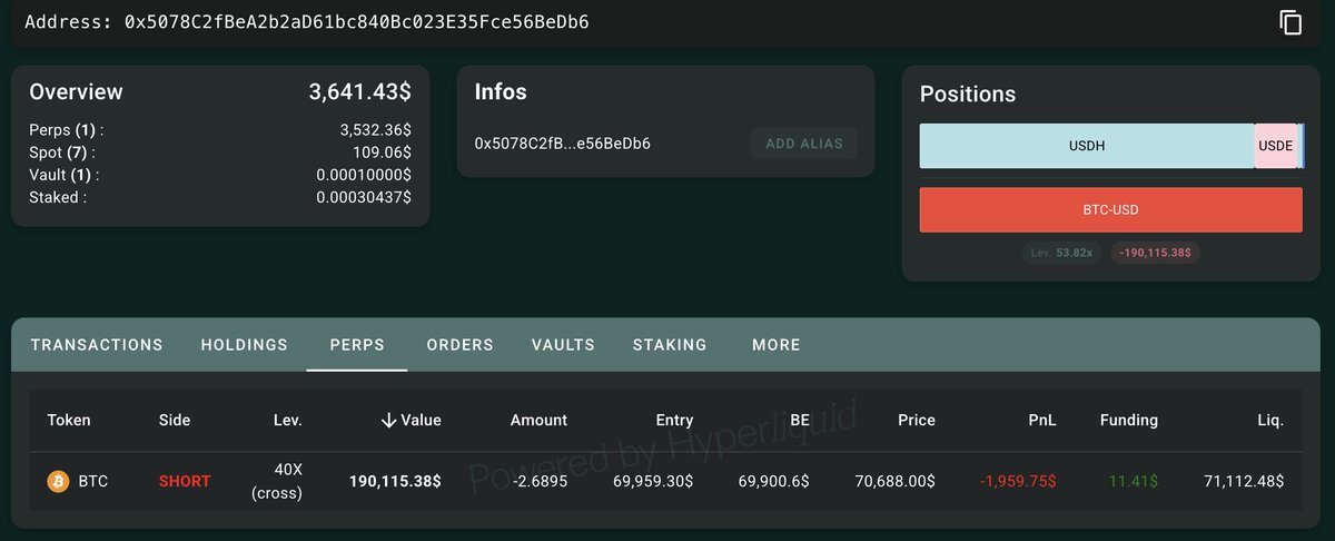 He claimed his referral reward of 1,654 $USDC, deposited 3,911 $USDC into HyperLiquid, and then opened a 40x short on 2.69 $BTC($190K).