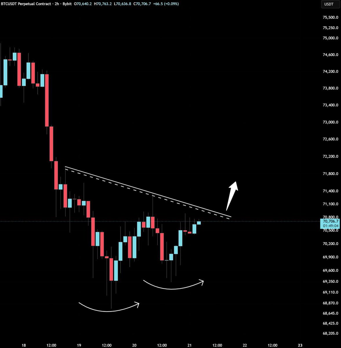 昨天的观点中认为反弹后可能会再打一个新低然后才开始上涨。目前行情在71366受阻下跌回到7万以下,尽管暂未新低
