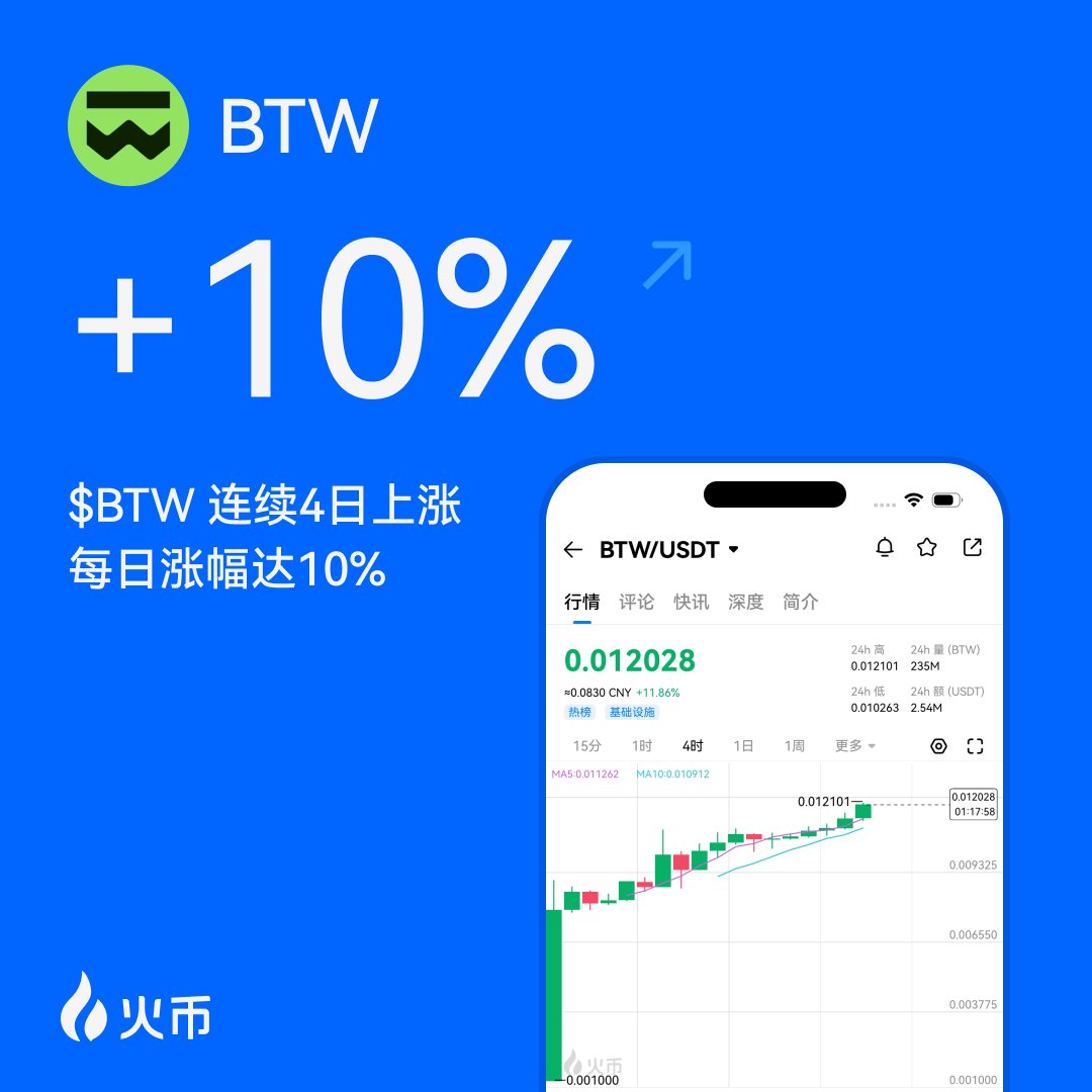 📈 上火币,炒火币!火就上,上就火! 🔥 【火币HTX数据监测显示】 $BTW 上线后连续4日上涨,每日涨幅达10%! 当前涨幅超 11.62%, 现报价 0.012 USDT 这,就是火币新资产!有没有买了 $BTW 的家人?评论区让我看到你们的双手~