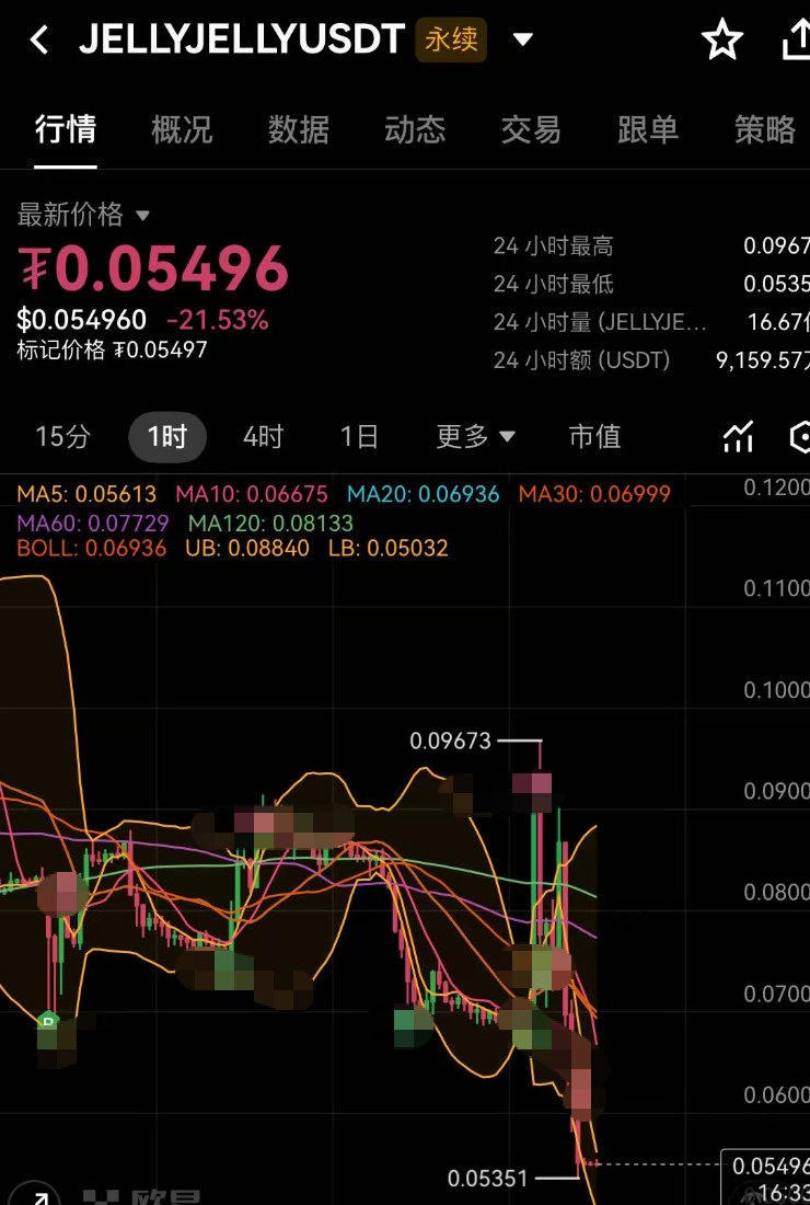 ✍️自己拉盘自己做空成为主流 前几天还和朋友聊天聊到,有些做市商只会一种操盘思路,就是拉盘没人跟就砸下来,重复进行。 而有的做市商真的就一直在创新,一直在割韭菜😭,cnm今天就被割了,又花钱上课了。 🌟 $JELLYJELLY 亏损实例 我平常就会在这个品类玩,以前一般都是链上买了,然后挂个单就不看了。 昨天闲着无聊看见跌到了70M附近,就买了点,然后今天看见费率变-0.1%的时候,觉得还行,又买了点。 然后早上96M没跑掉,因为我挂单挂在了110M附近,看了眼价格就TP了一半在90M附近。 然后中午吃饭的时候看见费率怎么开始-1.5%了,想了想会不会是为了爆空单,然后就又加了点。 然后诡异的事情来了,在70-95疯狂插针,然后在1点半左右的时候最后一次抵达90M附近。 然后就再也没上去过了。 这时候链上价格99M附近,而各个交易所的价格是70M附近,这时候我已经“逻辑出问题”了。 正常爆空单基本上合约会有折价但是不可能出现折价30-40%的情况,这时候空单就是有人无脑压价。 而这个时候“真想就只有一个”。 那就是狗庄自己构建了“大量空单”,来吸引对手盘做多然后砸现货,完成自己的出货。 这让我想起了前不久的 $POWER 就是一路拉上去,然后开始自己做空,顺利的完成了转移😭。 现在就是看 $JELLYJELLY 的庄是不打算玩了换一个品了,还是说会继续玩了。 这个标的经常出现暴涨暴跌的情况,很多人都佩服这个哥们,希望别弃盘吧,弃盘我又没了哎。 不过看一大家还是别玩这个了,需要熬,这个做市商估摸着也是第一次这么玩,也不好意思直接砸穿,然后一直把期现价格弄的差距30-40%。 最后的选择是直接砸高价格的,因为有很多人买了低价格的等着价格追平。(这个我一直在TG里更新来着) ✍️写到最后 肯定亏的会是最后一笔,但是做市商现在的操盘思路千奇百怪,还是得玩简单的那种思路的,复杂点的太绕了,不值得。 继续做减法了😑。 做市商还是越来越先进了😭