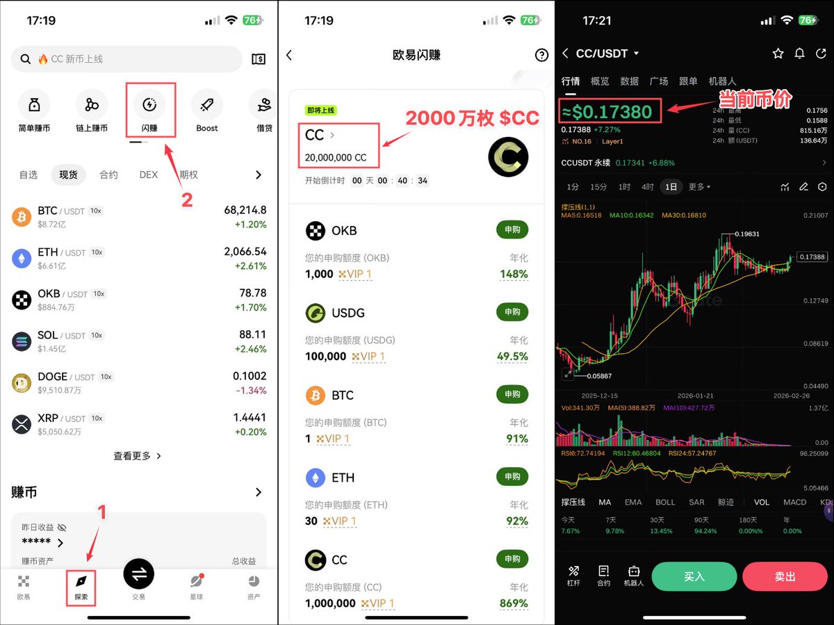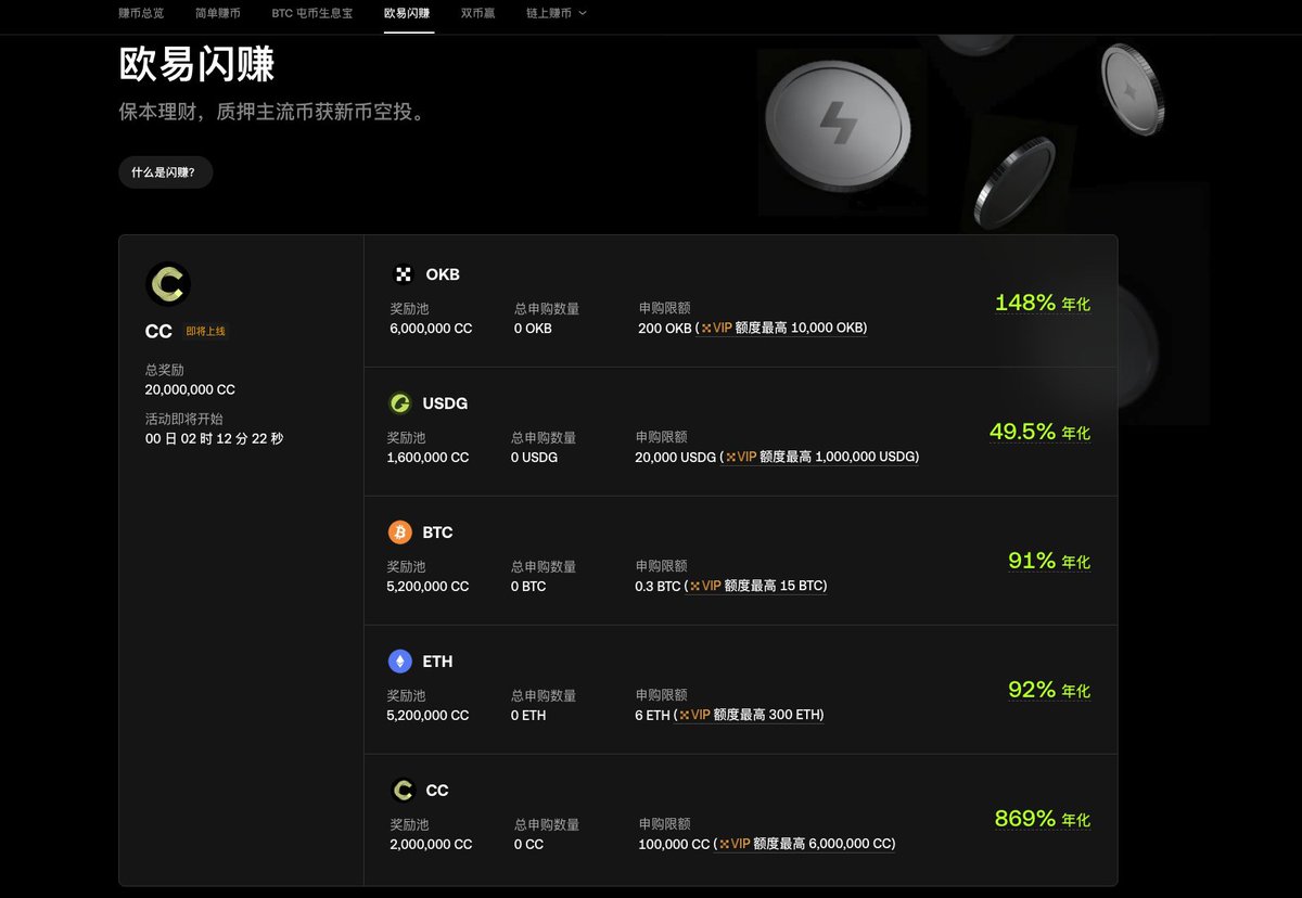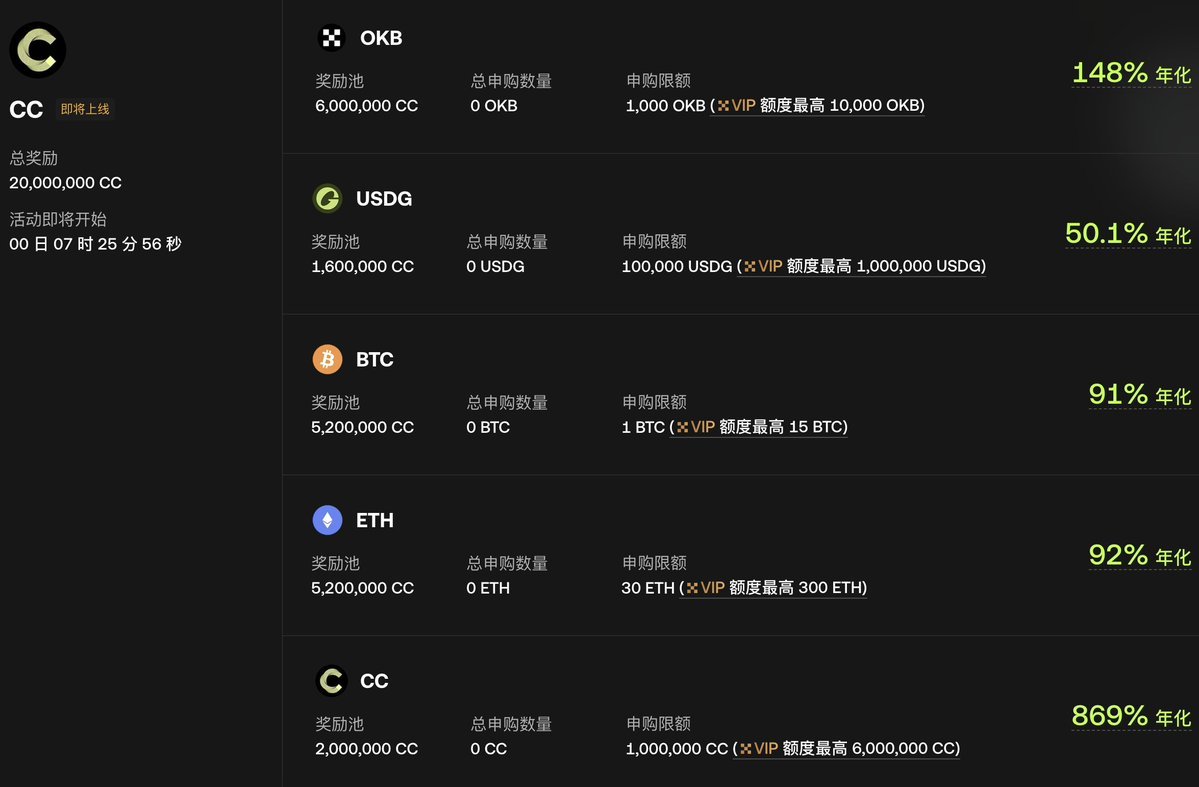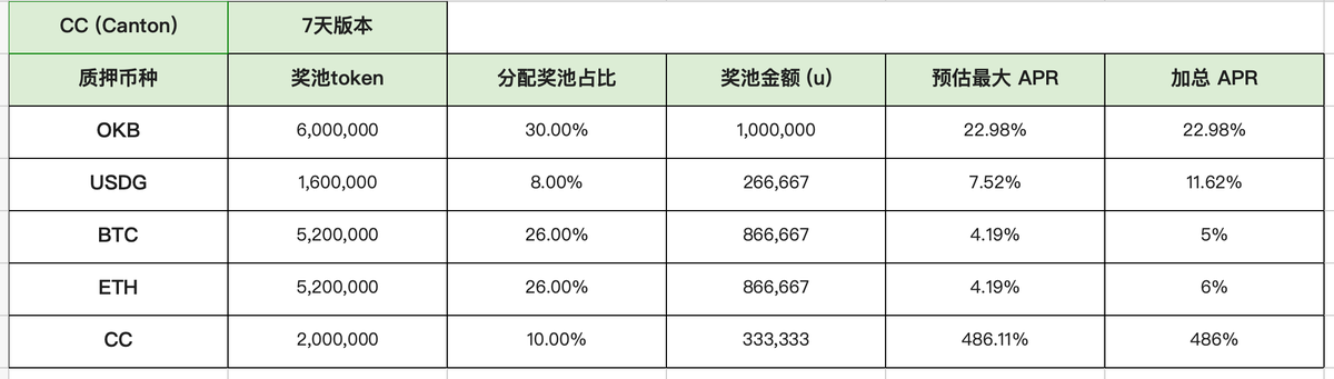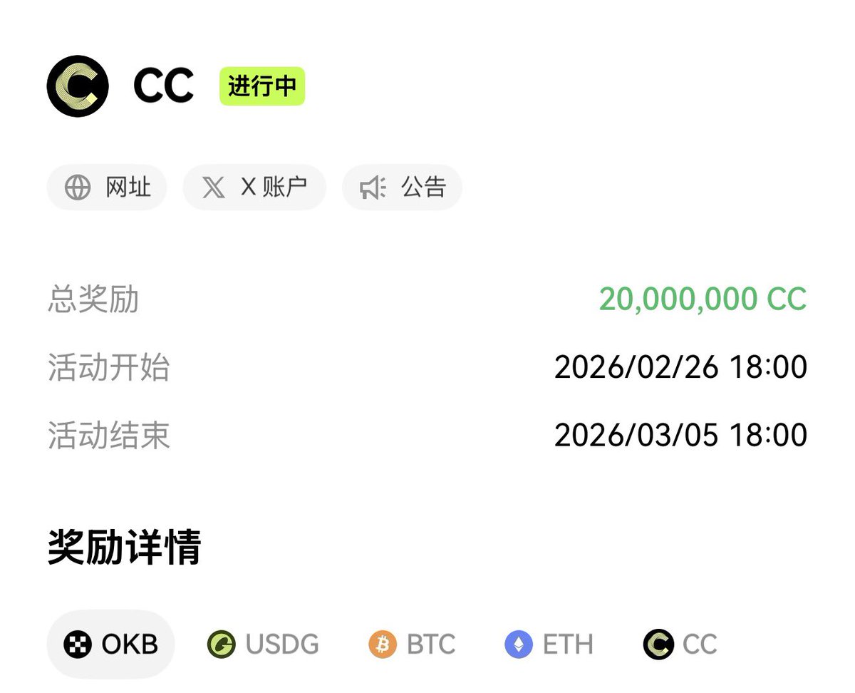 具体以OKX平台实时为准,总奖池:20,000,000 CC(实际APR随锁仓量动态稀释)