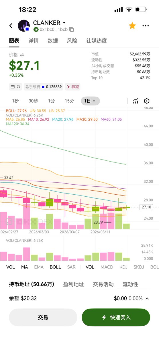 它这个平台的平台币叫 $clanker 在币安Alpha,和币安合约都有,然后现货币安没有,现货只有coinbase有,目前,等我看看袄,目前币价是27