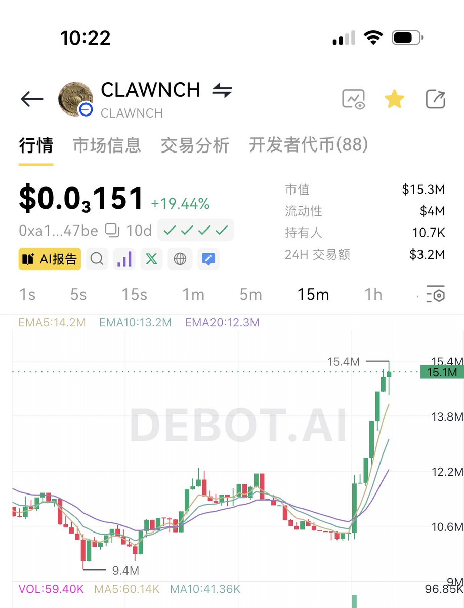 Base这两天小玩了下,一个 $clawnch 的竞品Ai Agent发射平台的 $mltl ,300K震荡很久,一天拉到了7M;