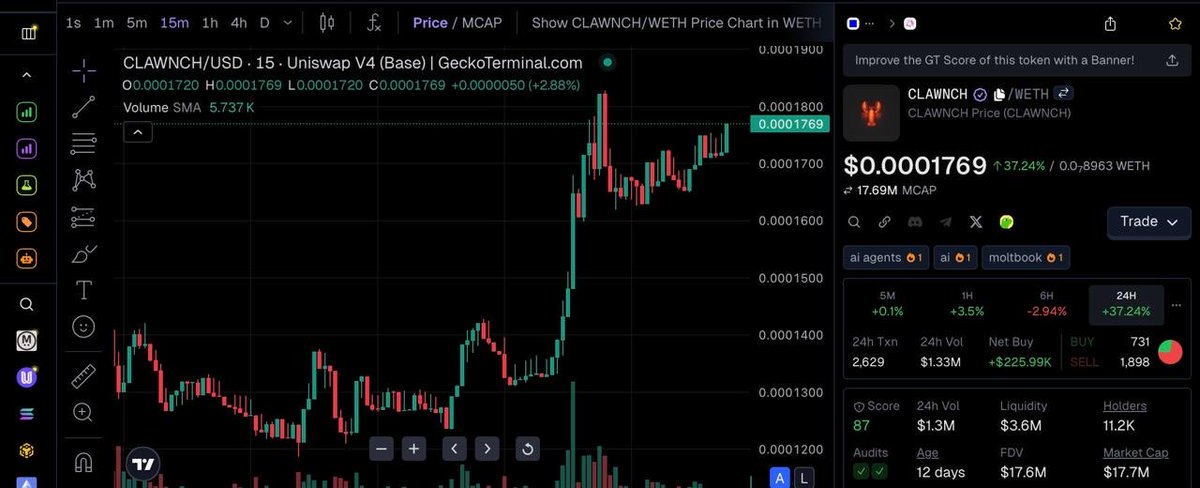 For $CLAWNCH on Base today, the charts tell everything: