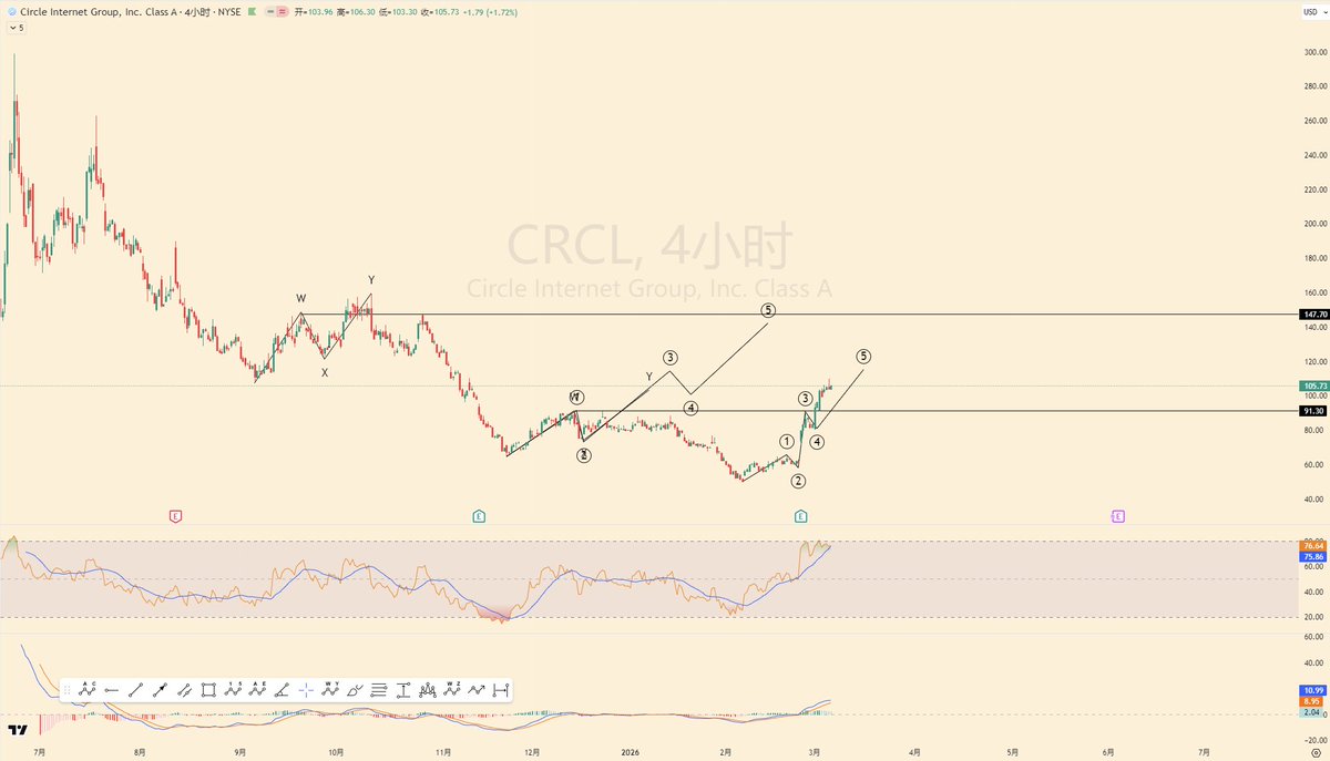 现在,我认为CRCL的下一次机会来了,从50开始的上涨,走出了非常强势的向上推动浪,在这个推动浪结束并完成回调之后,后边必然会至少跟随下一个推动浪;