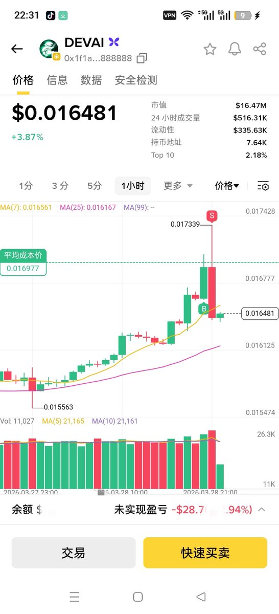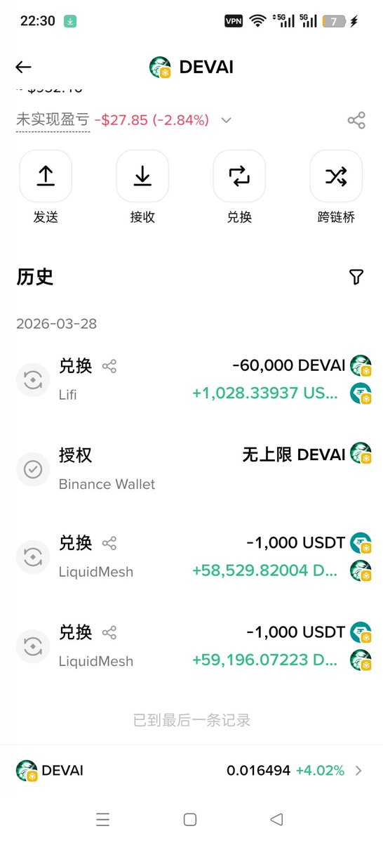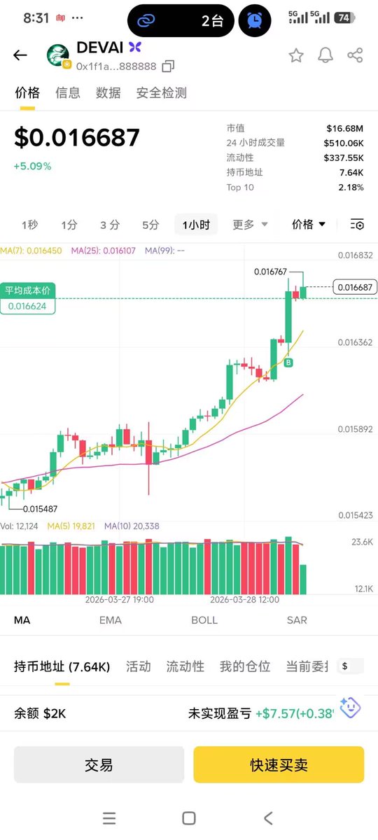 整体思路就是:朋友喊我的代币我会买,每个仓位控制1千刀—2千刀左右,但不会太分散,而且每个币我也不会去重仓,毕竟现在是熊市。今天朋友喊我买 $DEVAI 直接跟车2000刀