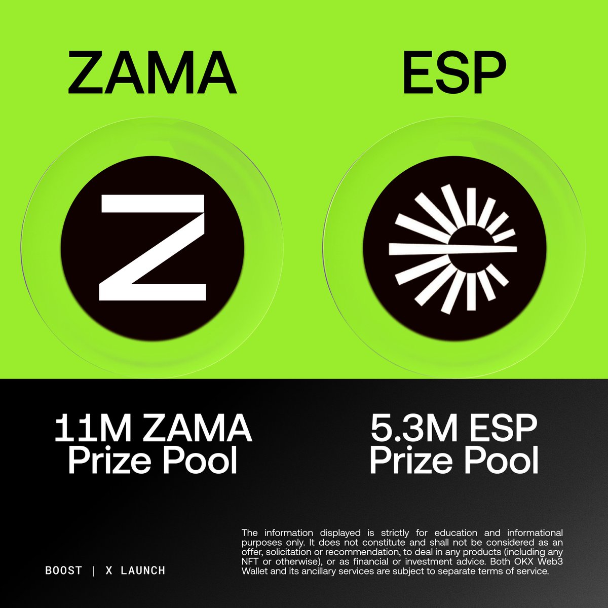 OKX马年第一次X Launch,奖池为11M $ZAMA 和 5,385,000 $ESP ,需满足 @okx Boost余额200,交易量400。