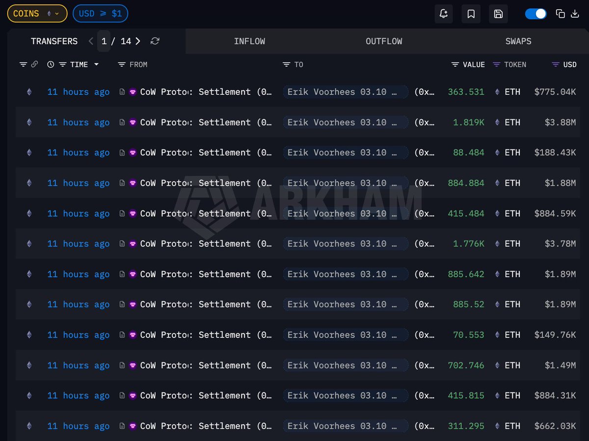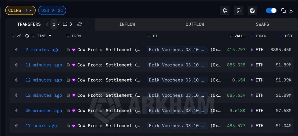 A mysterious whale, labeled as linked to Erik Voorhees, spent another 30.72M $USDT to buy 14,425 $ETH.