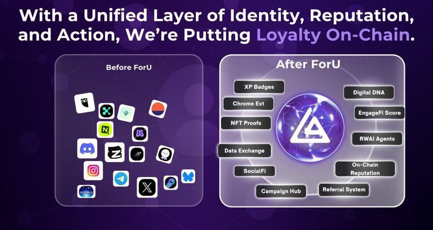 The $FORU token represents the incentive loop (XP boosts, campaign fuel, buybacks/burns).