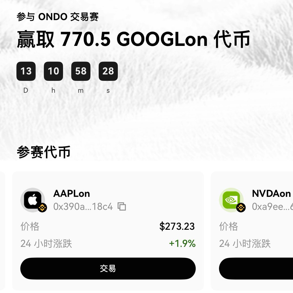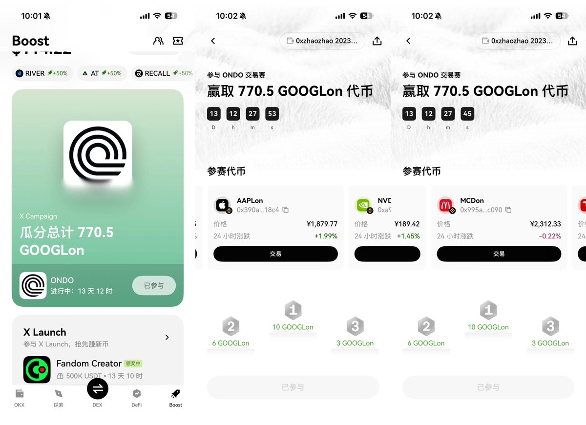 加密向下, 未来的山寨季, 是否真就在美股市场了? OKX Web3钱包Boost板块, 也上线了Ondo交易赛, 这一期是美股交易专场了。 交易美股代币, 成为Top 5000交易员, 最低可获得0.1GOOGLon奖励! 面向下一个周期, 是整点麦当劳?苹果?, 还是整点英伟达? RWA 尤其是美股代币化, 可能是下一个大周期入口, 比币圈纯山寨更可持续,也更合规。