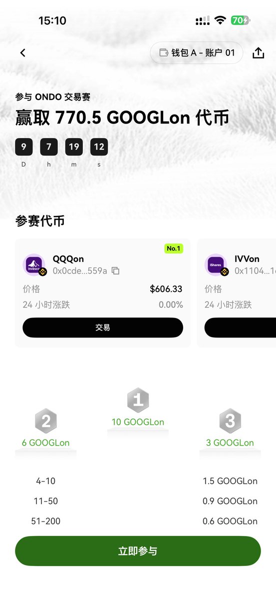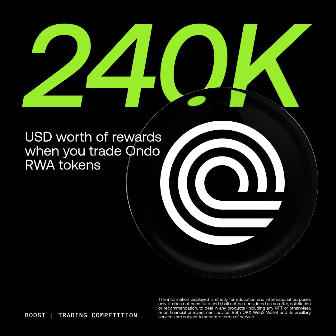 OKX @wallet @okxchinese ONDO 交易大赛开始了🎉 1. 准入门槛 资金要求: OKX 钱包 Boost 余额需 >$100。 报名: 必须点击“立即参与”按钮,且单笔交易金额需 ≥$20。 2. 有效交易规则 网络: 仅限 BNB Chain。 交易对: USDT/USDC 兑换指定代币(如 NVDAon、TSLAon、AAPLon 等 Ondo 系列 RWA 资产)。 排除项: 报名前的交易、API 订单、非指定币对均不计入。 3. 排行榜与奖励 名额: 前 5,000 名 获奖励,累计交易量需 >$100。 时间: 榜单 10 分钟更新一次;活动后 3 个工作日内公示。 领取: 公示后 14 天内 需前往“奖励中心”手动领取。 交易时段: 仅限美股工作日(周末及美股假期无法交易)。 建议: 每笔金额略大于 $20 以防扣除手续费后金额不足。 传送门:https://t.co/G82Fp3Gw1Y