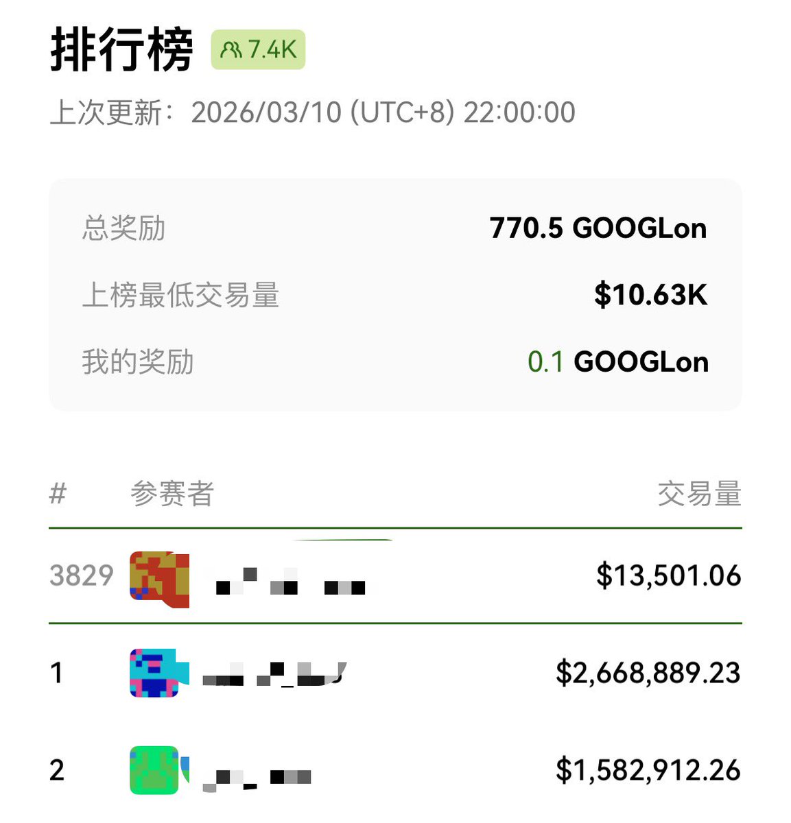 Ok钱包的这个活动钱包里有100u以上的可以去参加一下,实测15U手续费大概刷15000的交易量 活动还有最后20分钟,可以偷鸡,目前0.1 $GOOGLon 值30U