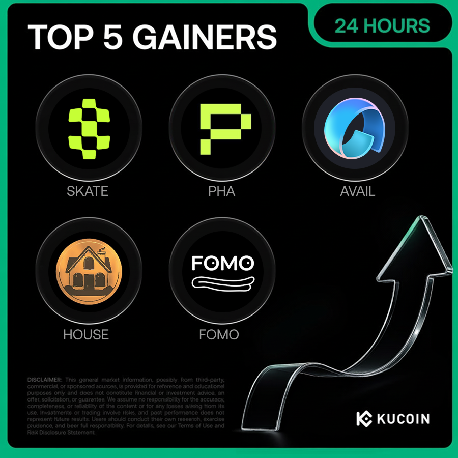 🚀 24H Top 5 Gainers on #KuCoin (March 4, 2026) 1. $SKATE - $0.00241 (+76.30%) 2. $PHA - $0.0383 (+47.08%) 3. $AVAIL - $0.00510 (+44.97%) 4. $HOUSE - $0.002 (+37.74%) 5. $FOMO - $0.00000276 (+28.49%) Check Out Today's Top Crypto Gainers on KuCoin! https://t.co/r4YP3AqYLU New to KuCoin? Sign up to participate 👉 https://t.co/oMHF4BfQas #Ku24hour
