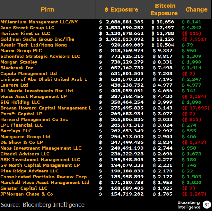 增持比较明显的包括一些大家熟悉的名字,比如 Millennium、Jane Street、Morgan Stanley、BlackRock、Citadel,以及阿布扎比相关主体等都在买入 Bitcoin 现货 ETF ,从而间接持有 Bitcoin 。
