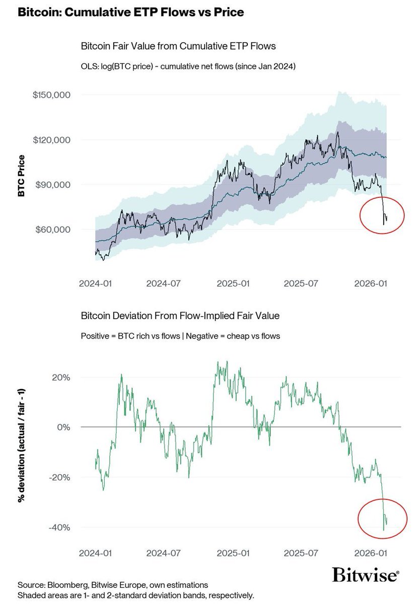 刚刚看到 Bitwise 的数据,简单来说 Bitwise 认为虽然 $BTC 的价格走势急剧下跌,但 Bitcoin 现货 ETF 的持仓量并没有出现崩溃的迹象,代表了这次下跌更像是“价格先跌、流量维持”的结构性错位,而不是典型的“ETF 资金踩踏式赎回”。