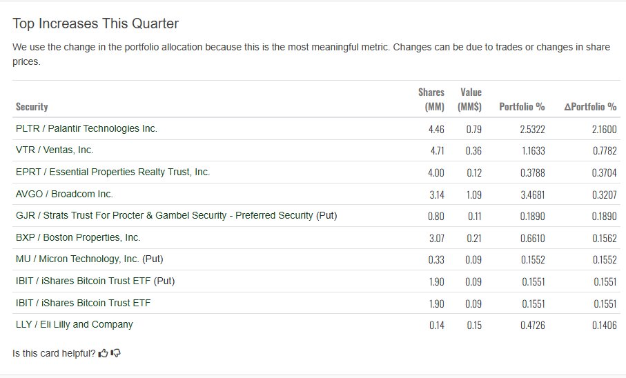 对每个季度 13F 都会有报道,可以去看数据。但数据确实太多了,不过可以现在可以通过 AI 来查找,目前 13F 的数据并未完全公布结束,但已经可以查到部分信息,另外不用担心 13F 的数据造假。