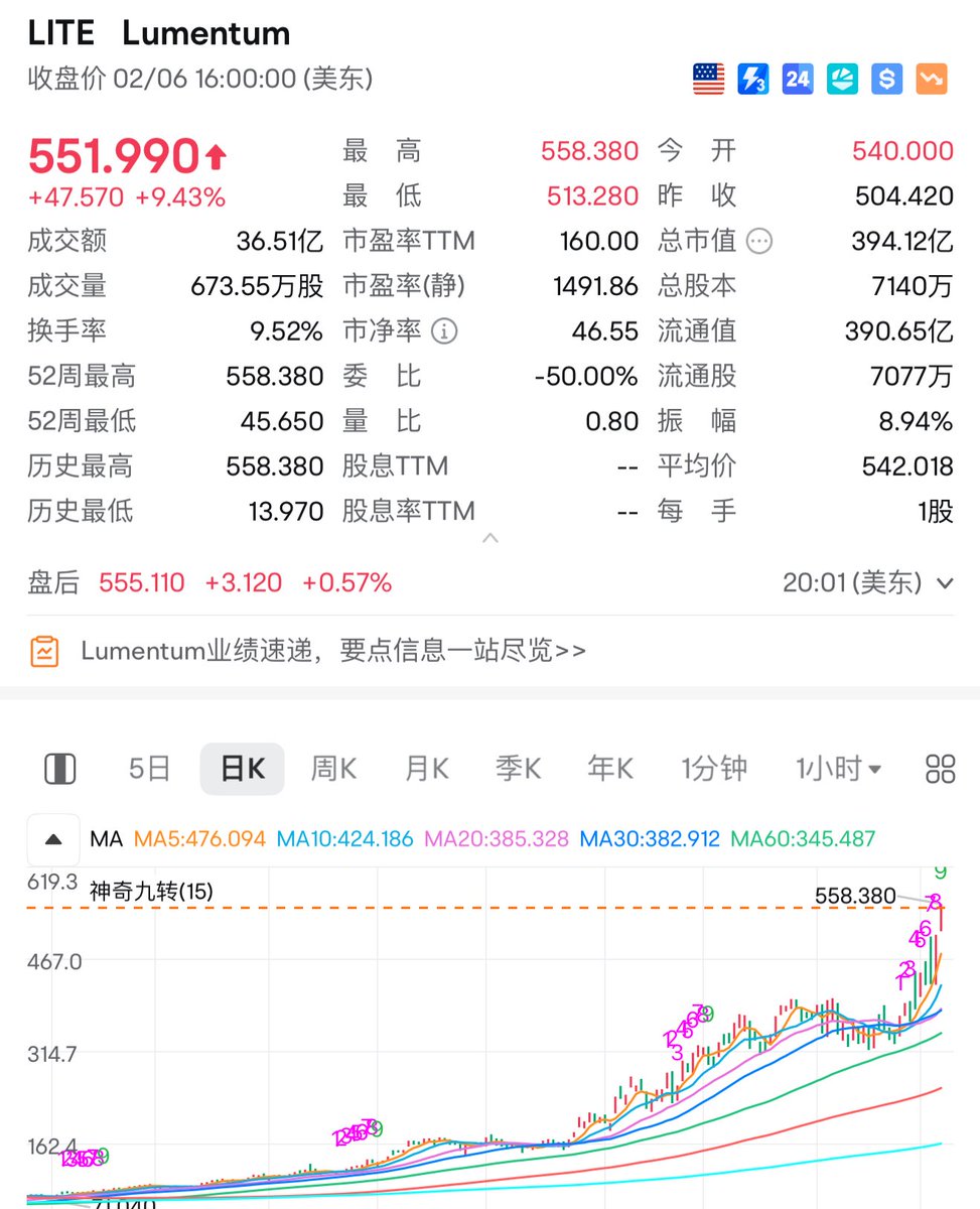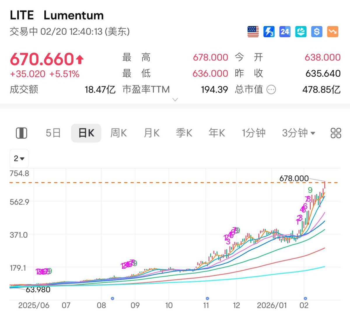 ✔️$LITE :Lumentum 这间公司是全球光学与光子产品领导者,制造用于光通讯、商业激光还有3D感测的组件与模组。产品涵盖美洲、欧洲、亚洲、中东、非洲,主要应用于电信网路、AI基础设施这些与量子计算。去年全年营收16.5亿美金,净利 2590万美金,股价目前约465.54 ,1 年涨幅 440.10%,市值约330亿美金,光通讯与AI相关光子市场正高速成长,预计未来几年持续爆发