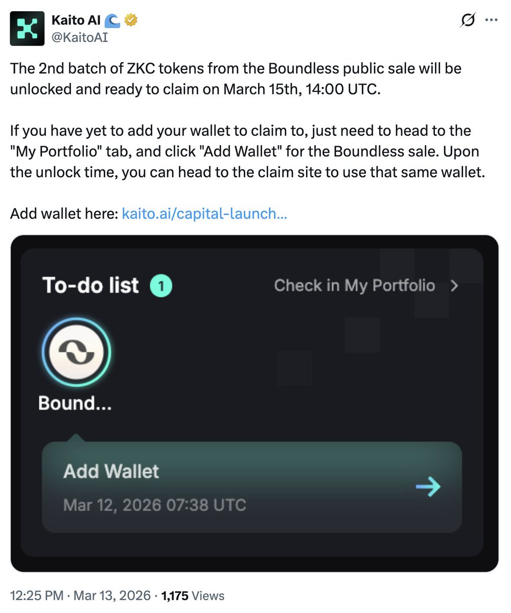 好消息: 过2天15号可以领Kaito 打新 @boundless_xyz 剩下的50% ZKC 代币 坏消息: ZKC 币价已跌90% 温馨提示: 鬼精的Kaito 把你们claim 的地址清除了,需要手动再添加一次。