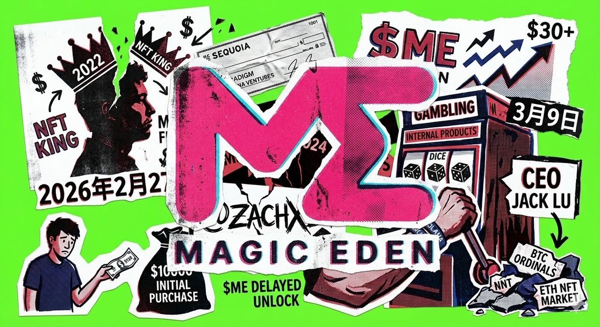 没人在意的角落,Magic Eden 放弃了 NFT 市场,转做赌场 2022年,@MagicEden 是 NFT 市场的王者,拿到$1.59亿融资,红杉、Paradigm、Solana Ventures 投资 2023年$ME代币上线,币价一度冲到$30+ 2024年熊市,裁员、收缩 2025年被 @ZachXBT 曝机器人刷量, $ME 解锁延迟 2026年2月27日,CEO Jack Lu宣布转型,3月9日正式关闭 BTC Ordinals 和 ETH NFT 市场,只做Solana和内部赌场产品Dicey 现在 $ME 代币多少钱?当年$10000买的,现在值 $150
