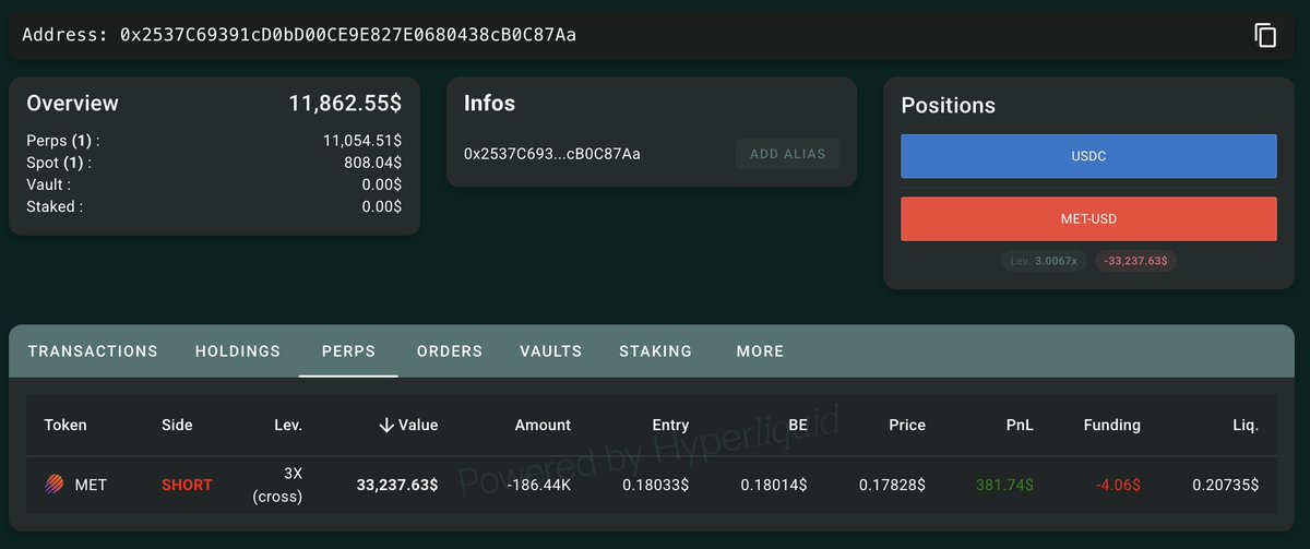 Someone created a new Polymarket wallet and spent $5,891 to bet that #Meteora will be accused of insider trading by @zachxbt. He also deposited 11,500 $USDC into #Hyperliquid and opened a 3x short on 186,435 $MET($33K).