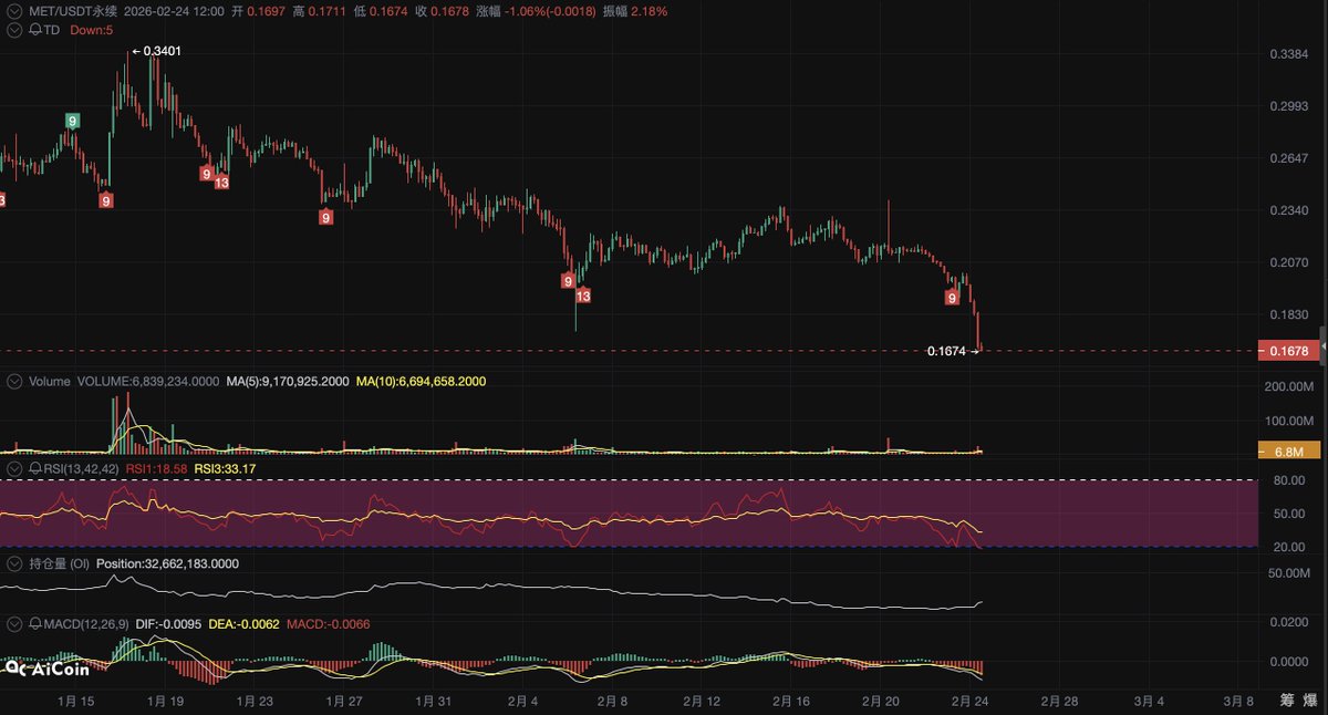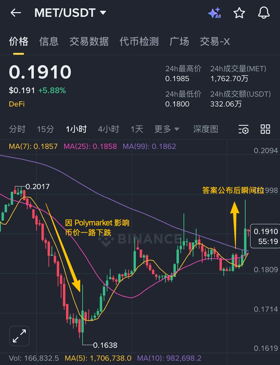 好在 Axiom 没有发 Token,不然早跌麻了 —— 隔壁 Meteora:???😵‍💫 自 Zach 预告发文起,因 Polymarket 票型影响 $MET 从 $0.2017 最低跌至 $0.1638,跌幅达 18.8%;而公布答案的瞬间币价最高拉到 $0.1985,现在 $0.191