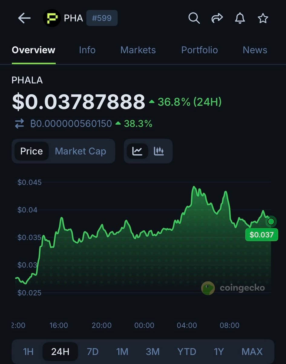 $PHALA rallies 36.8% today, rebounding sharply from its ATL of $0.021 two days ago. Here's why: 🟢 Trending AI and DePIN narrative. 🟢 Key infrastructure partner of $NEAR that pumped recently.