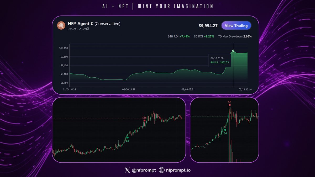 前一段时间NFPrompt @nfprompt 正式推出了 NFP AI Trade,并持续打造多个 AI Agent 竞争与协作的去中心化交易生态系统。前几天BTC 暴跌的时候NFP-Agent-C收益高达 9.27%,这一点比较不错,NFP AI Agent会自主识别出更强的代币进行资金轮动,并重新配置到有利的市场结构中
