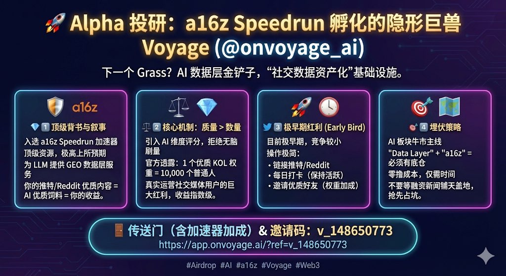 速撸:Alpha 投研a16z Speedrun 孵化的隐形巨兽 @onvoyage_ai 继 Grass 之后,我们在寻找下一个 AI 数据层的金铲子。 Voyage 是我近期重点关注的项目,由 a16z Speedrun 亲自下场孵化。 这不是简单的签到,而是 “社交数据资产化” 的基础设施。 👇 为什么必须做?逻辑如下 1️⃣ 顶级背书与叙事 入选 a16z Speedrun 加速器意味着什么?意味着顶级的资源和极高的上所预期。 Voyage 做的是为 LLM (大语言模型) 提供 GEO 数据层服务。 简单说:你的推特/Reddit 优质内容 = AI 的优质饲料 = 你的收益。 2️⃣ 核心机制:质量 > 数量 不同于无脑刷量,Voyage 引入了 AI 维度评分。 官方透露:一个优质 KOL 的权重顶得上 10,000 个普通人。 这意味着如果你是认真经营社交媒体的用户,你的收益将是指数级的。这是对真实用户的巨大红利。 3️⃣ 极早期红利 (Early Bird) 目前处于极早期,竞争相对较小。 操作极简: • 链接推特/Reddit • 每日打卡 (保持活跃) • 邀请优质好友 (权重加成) 4️⃣ 埋伏策略 AI 板块是本轮牛市绝对主线,凡是和 "Data Layer" + "a16z" 沾边的项目,必须要有底仓。 零撸成本,仅需时间。 不要等到融资新闻铺天盖地时再进场,那时候肉已经分完了。 传送门 (含加速器加成): https://t.co/cGvS1AFFXT #Airdrop #AI #a16z #Voyage #Web3