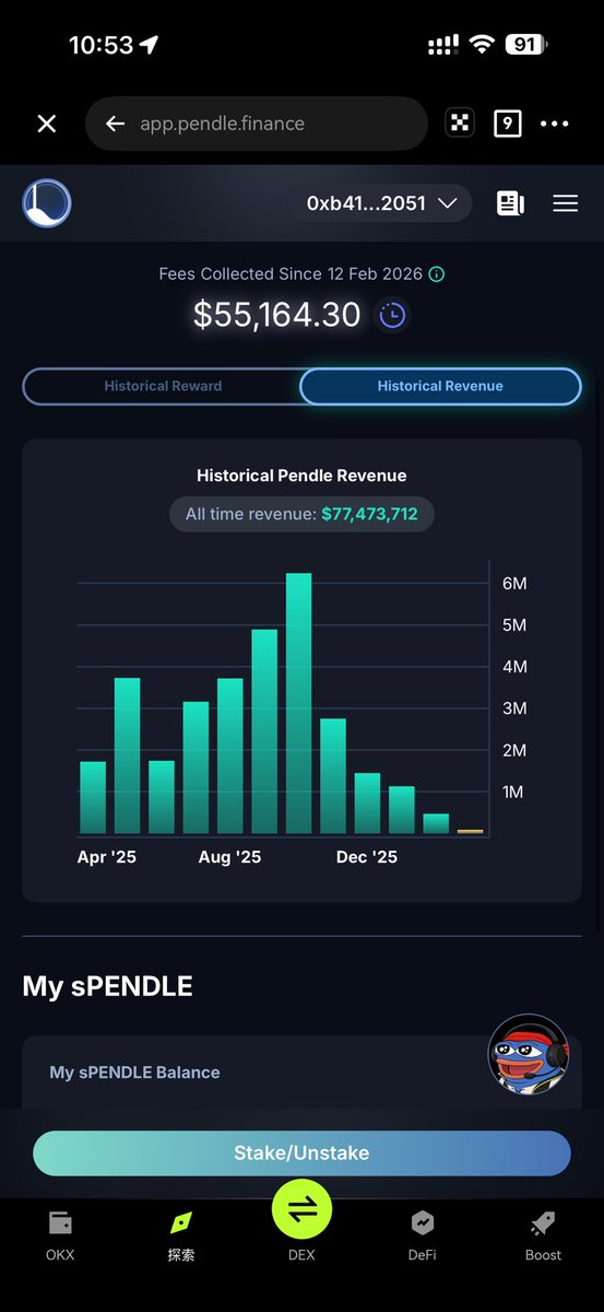 那个币安前 Listing 所言 在盯着流动性,注意力和筹码 这种价值观下筛选出的 99% 就是长期归零 而 $Pendle /我有 31万个 为代币质押者回馈了 7700万美金的生态收益 很有讽刺意味的是 $Pendle 市值现在仅仅 2.1 亿美金 而所谓的流动性,注意力和筹码结构驱动下 很多长期归零币的市值远高于此