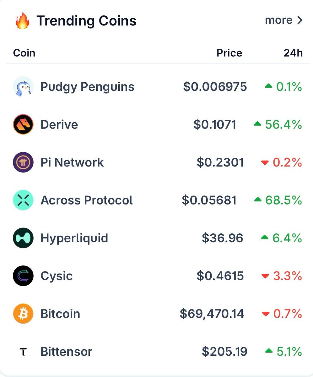 This week, $PENGU (@PudgyPenguins) leads the pack, followed by $PI (@PiCoreTeam), and $SOL (@Solana).