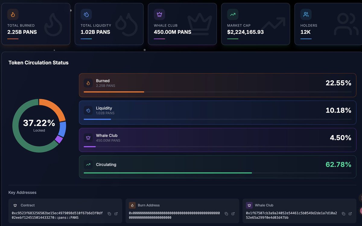 网站更新~非常喜欢这种极客风格! #Sui 上的开发者有以太坊开发者的感觉。 这个Dex的燃烧机制非常好玩,细品真是天才Dev👍 @0x_hellopanda 100%通缩:买卖 $Pans 都会自动销毁一部分!网站可查 而且双重销毁:交易费买回Pans后直接销毁,超过20%,进入LP销毁模式(目前33%) LP销毁怎么肥事?那就是为 $Pans 创建新的流动性池: 每当手续费累积足够,推出新的 Meme 币(如 EGS、Lions、Bears…),铸币权限永久销毁,LP池永久锁定。锁定在池中的 PanS 也就永远消失,Pans稀缺性直线上升。新池子的币的价值也能保证,因为资金不会被抽走和被盗! 另外平台还有NFT,币价上涨,NFT一定上涨!我们下一期再讲! 你要先买币:0xc9523f683256502be15ec4979098d510f67b6d3f0df02eebf124515014433270::pans::PANS 持续关注~ @0xPandaSui