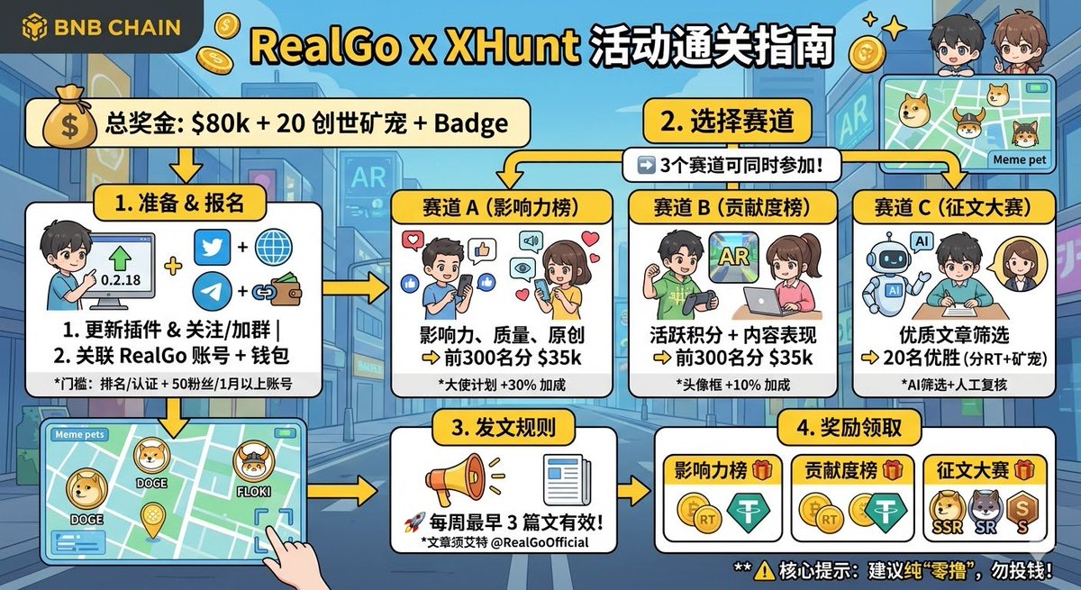 项目方明牌送福利 👉@RealGoOfficial×@xhunt_ai的「Let's RealGo」活动确实刚在3月19日正式开跑,奖池明牌 80,000+ USD,细节跟你说的基本吻合:10,000 USDT + 价值70,000 USD的 $RT 代币 + 20台 Genesis Mini Harvesters(创世矿机/矿宠,每台约值3.4 BNB,可用于生态内挖矿、租赁或产生收益)。