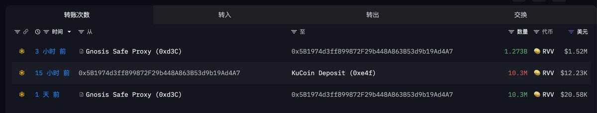 ◎另外 50 亿枚 RVV ($597 万) 目前虽然没有转进交易所,但接收这些币的地址在昨天向上面提到的几家交易所转移过 RVV,所以不排除接下来这些币也进入交易所的可能。