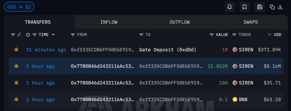 地址 0xff3…581D7 向新地址转移 816 万美元的 $SIREN ,随后向 #Gate 充值了其中 100 万枚,大约 37.2 万美元💡
