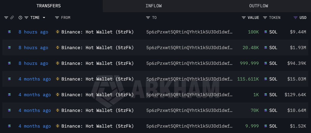 Whale 5p6zPz withdrew 121,480 $SOL($11.47M) from #Binance after 4 months of inactivity. 4 months ago, he withdrew 186,621 $SOL($25.81M) from #Binance at $138, and is now down over $8M. Despite the loss, he bought more $SOL 8 hours ago.