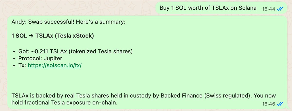 Just bought $TSLA through WhatsApp… on Solana Solana is finally ready for boomers