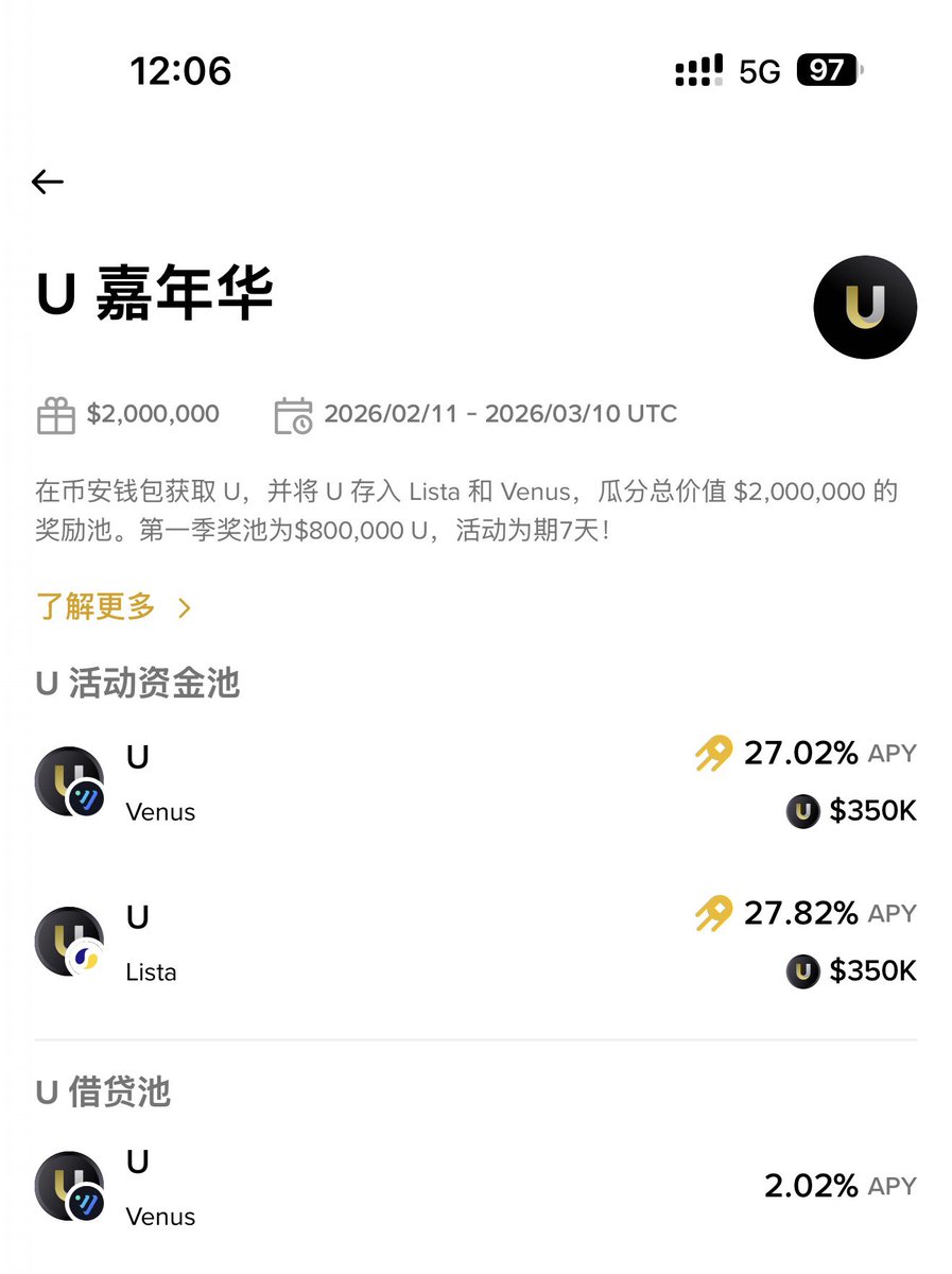 期待已久的稳定币补贴大战终于是来了~ $U 前天宣布上线补贴活动,总奖励共 200 万美金。 活动从 2.12 一直持续到 3.10,不过分为两个阶段,可能有小伙伴不太清楚活动的规则。 ➤ 大概是这样: 第一阶段:2.12 - 2.19 总奖励 80 万美金,分为参与奖和瓜分奖; 第二阶段:2.19 日起,总奖励 120 万美金,规则尚未公布。 也就是说,目前可参与的第一阶段,无论是大资金还是小资金都可以参与,特别是参与奖只需要存 100 个 U 就行。 这个低保还是很值得参与的。 大资金的瓜分奖励就没有什么技巧了,存就完了。 目前币安钱包内显示 U 的年化在 13% 左右。 叠加上瓜分奖励,收益更高。 然后,按照目前 U 的溢价,借币也不如直接买币划算。 另外就是币安的 USD1 持仓活动将在 2 月 20 日结束,U 的第二阶段活动算是对 USD1 的无缝衔接。 估计吧,在 2.19 时,U 的价格会有波动,那时候应该会有套利和博弈的空间。 总之,低保是必须参与的,之前刷 Alpha 的账户都可以用起来。 ➤ 具体参与步骤如下(图): 1/ 在币安交易所买入 U; 2/ 划转至币安钱包(教程见往期文章); 3/ 在首页点击横幅进入活动; 4/ 选择 Venus 或 Lista,点击申购即可。 当然,获取 U 的方式除了直接买入,也可以通过 Venus 或 ListaDAO 借款。 但按当前借贷抵押率测算,在 U/USDT 溢价约为 1.0005,直接买比借划算,买的话币安交易所比链上划算。 就酱,稳定币补贴好啊,让大家好好过年,过个好年! 多点时间可以陪陪家人,哈哈哈~ 提示:以上仅为信息分享,不构成投资建议,请务必自行做好研究! DeFi 爱好者:BitHappy @UTechStables