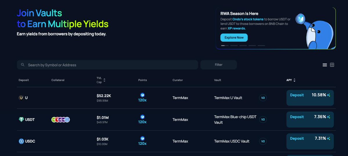 之前有在 @TermMaxFi 存款拿XP的可以转过来这个新活动。 除了APY收益外,目前有120倍的奖励和 瓜分Venus Flux 给的100 万美金。 单单以XP来说就比之前的任何一个活动划算,包括之前的Turbopad。 因为Turbopad 是需要存到一定期限才能获得倍数加成,不过这个活动只是到4月27号。 如果你是第一批进turbopad 的可以不用换过去。 再说下个人看法,这次把 Venus Flux 接进来了,把 @UTechStables@0xFluid、Venus 这些模块整合在 BNB 上,说白了就是让稳定币别再躺着。 利息 + 激励 + XP 三层一起跑,效率比单一活动高很多。 我个人加了点进去拿XP,但主要还是注重AP,而你怎么看呢? 备注📝:纯属于个人分享,绝无收费